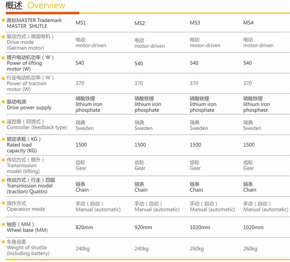 MS智能型穿梭车产品设计先进,配置高端,功能强大,装配精良。关键的电机、减速机、驱动器、控制器,回馈式数显遥控器、激光感应测距器等核心光电组件等均采欧美进口高品质组件,和国内普通穿梭车相比具有承载大、速度快、配置高、功能全的特点。穿梭车外型为重金委托专业工业设计公司设计,外观新颖,符合人机工程学原理要求。